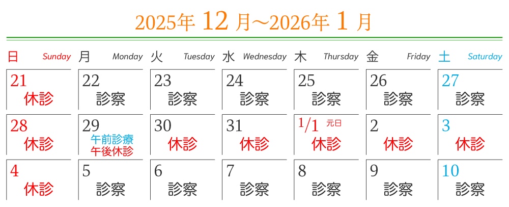 2025年12月29日(月)午後から2026年1月4日(日)まで年末年始の休診とさせていただきます。